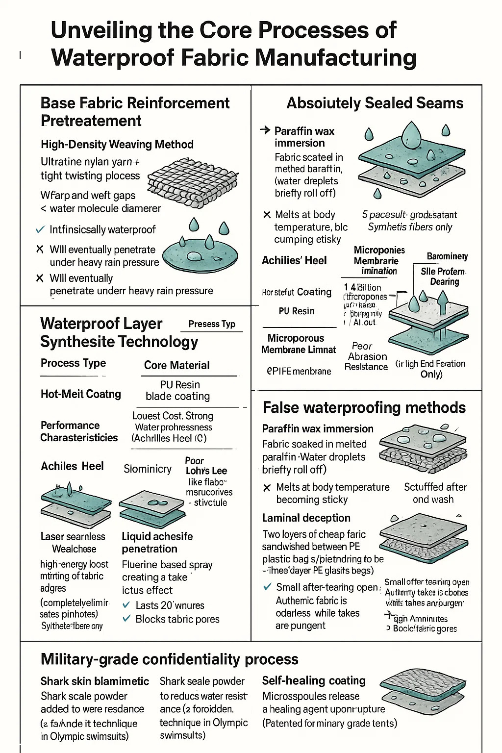 | Hotmelt-coating | Polyurethaan (PU) hars | • Laagste kosten • Extreme waterdrukbestendigheid | • Geen ademend vermogen (verstikkend als plastic zeilen) |