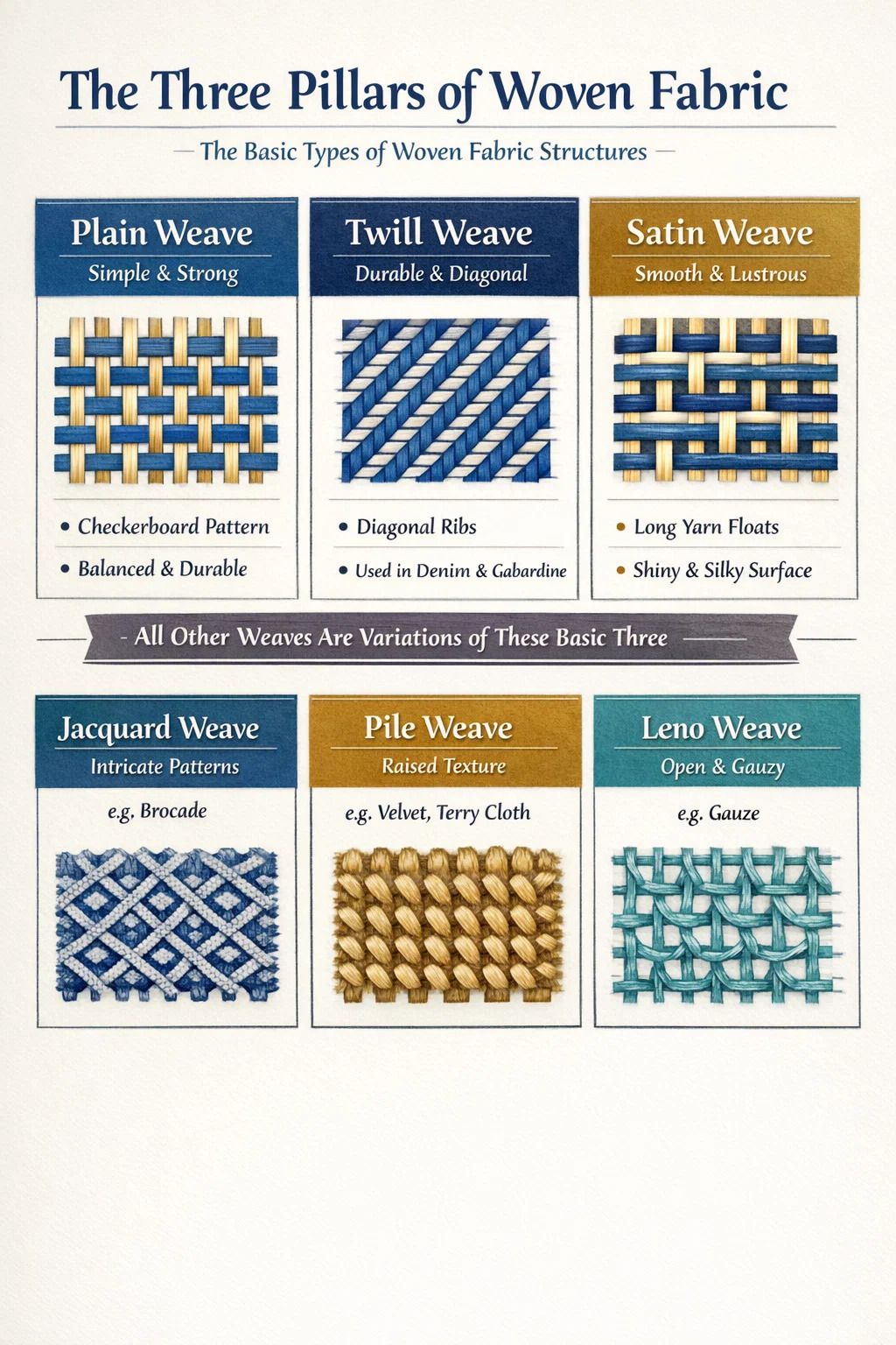 Hoewel er honderden specifieke marktnamen voor textiel bestaan, zijn die er technisch gezien ook drie fundamentele soorten geweven stof structuren waarvan bijna alle andere zijn afgeleid: Platbinding, keperbinding en satijnbinding . Elke andere variatie, zoals jacquard-, dobby- of poolweefsels, is een complexe aanpassing van deze drie fundamentele verweven patronen. Het begrijpen van deze categorieën is essentieel voor het identificeren van de duurzaamheid, drapering en bruikbaarheid van elk textielproduct.