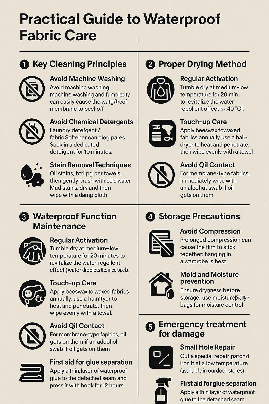 Vermijd machinaal wassen: Machinewassen en drogen in de droger kunnen er gemakkelijk voor zorgen dat het waterdichte membraan loslaat. Handen wassen en zachtjes wrijven zijn de veiligste opties.