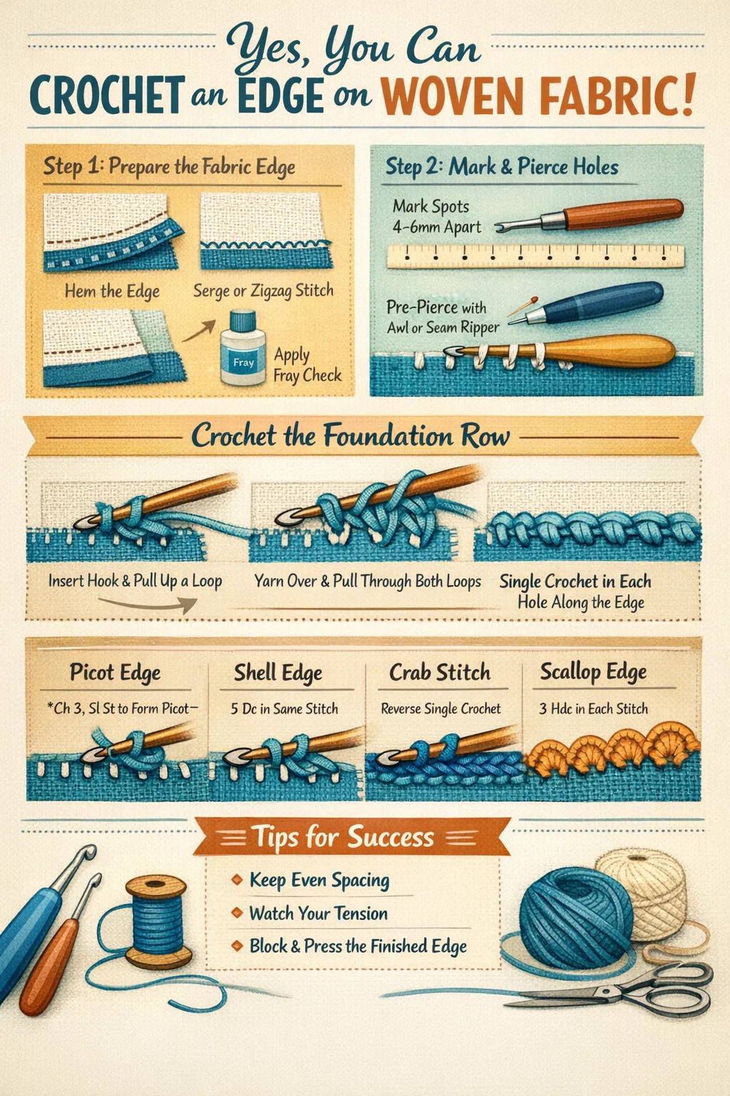 In tegenstelling tot gebreide stof heeft geweven stof geen natuurlijke lussen waar je je haak in kunt steken. In plaats daarvan prik je door de stof zelf of werk je door vooraf gemaakte gaten. Daarom maken techniek en voorbereiding het verschil. Als je eenmaal de werking begrijpt, wordt het toevoegen van een gehaakte rand aan geweven stof – of het nu katoen, linnen, denim of ander geweven textiel is – een herhaalbare, bevredigende vaardigheid.