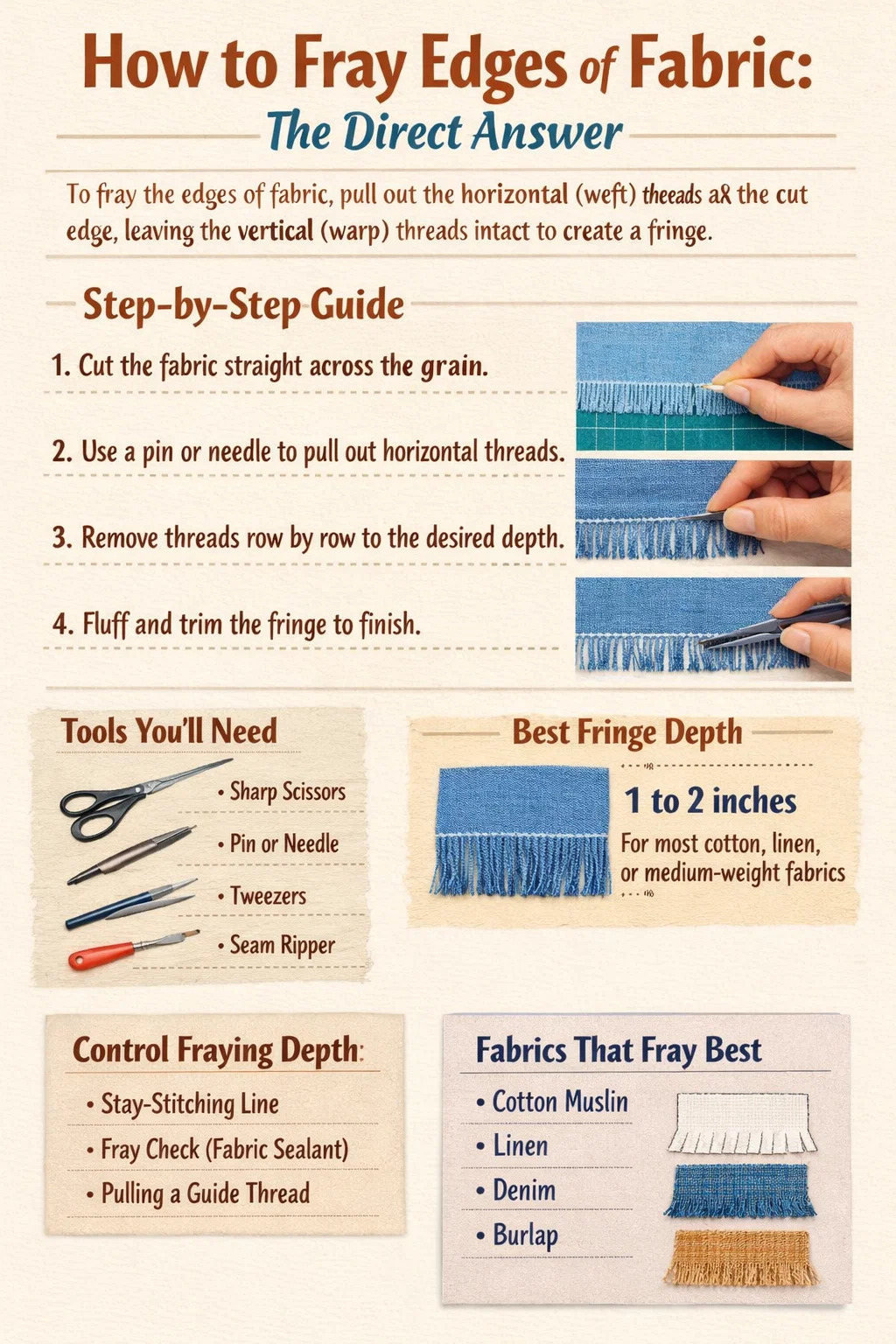 Om de randen van de stof te rafelen, trek je de horizontale (inslag)draden langs de snijrand van een geweven stof naar buiten, waarbij je de verticale (ketting)draden intact en los laat. Hierdoor ontstaat de karakteristieke pony- of rafellook. De meest betrouwbare methode is om een rechte snede te maken en vervolgens een speld of naald te gebruiken om de draden één voor één los te maken en uit de rand te trekken, rij voor rij werkend tot je de gewenste ponydiepte hebt bereikt. Voor de meeste middelzware geweven stoffen, zoals katoen of linnen, draden eruit trekken tot een diepte van 1 tot 2 inch creëert een volle, aantrekkelijke pony zonder de structurele integriteit van het stuk in gevaar te brengen.
