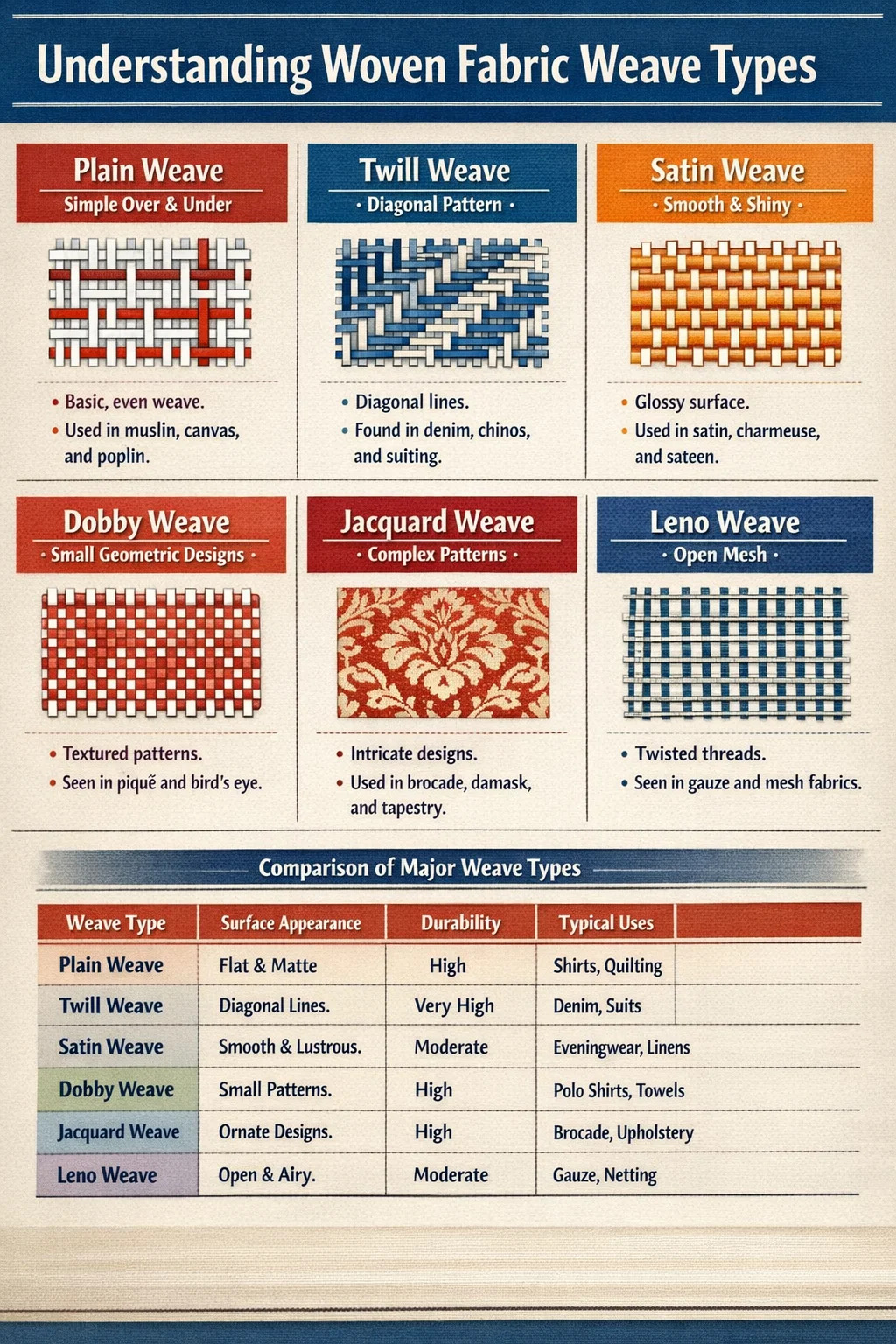 De onderstaande tabel vat de belangrijkste eigenschappen en veelvoorkomende toepassingen van elk belangrijk weeftype samen om directe vergelijking gemakkelijker te maken.