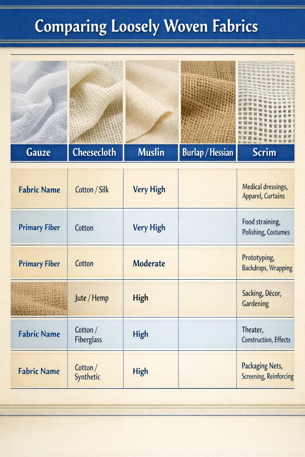 | Kaasdoek | Katoen | Zeer hoog | Voedsel uitpersen, polijsten, kostuums |