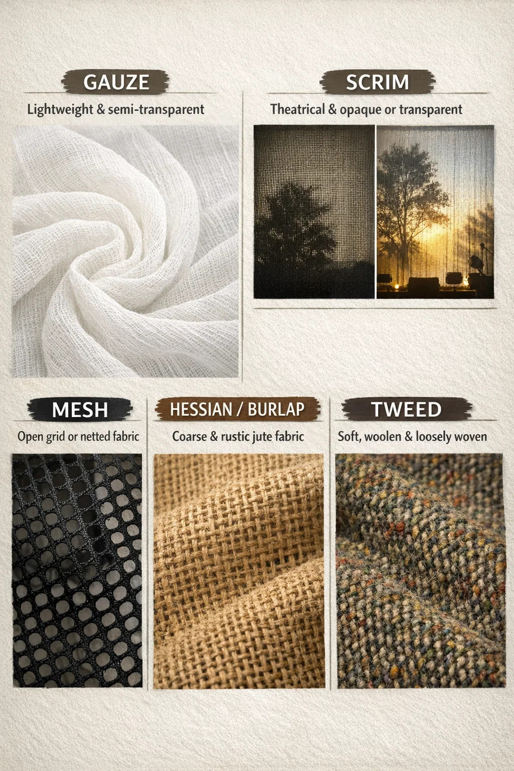 Wanneer er over gesproken wordt geweven stoffen met een "losse textuur en grote gaten" zijn er verschillende zeer specifieke termen om ze te beschrijven, afhankelijk van hun gebruik en uiterlijk.