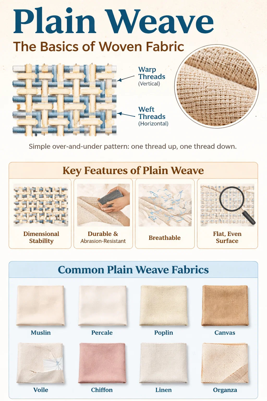 De meest elementaire geweven stof is effen geweven stof —een textiel gemaakt door kettingdraden (die in de lengte lopen) en inslagdraden (die kruislings lopen) met elkaar te verweven in een eenvoudig afwisselend over-en-onder-patroon. Elke inslagdraad gaat over de ene kettingdraad en vervolgens onder de volgende door, over de volledige breedte van de stof. De volgende rij keert deze reeks om. Hierdoor ontstaat de strakste, meest uniforme en meest stabiele van alle geweven structuren, en het is het startpunt om te begrijpen hoe alle geweven stoffen zijn opgebouwd.