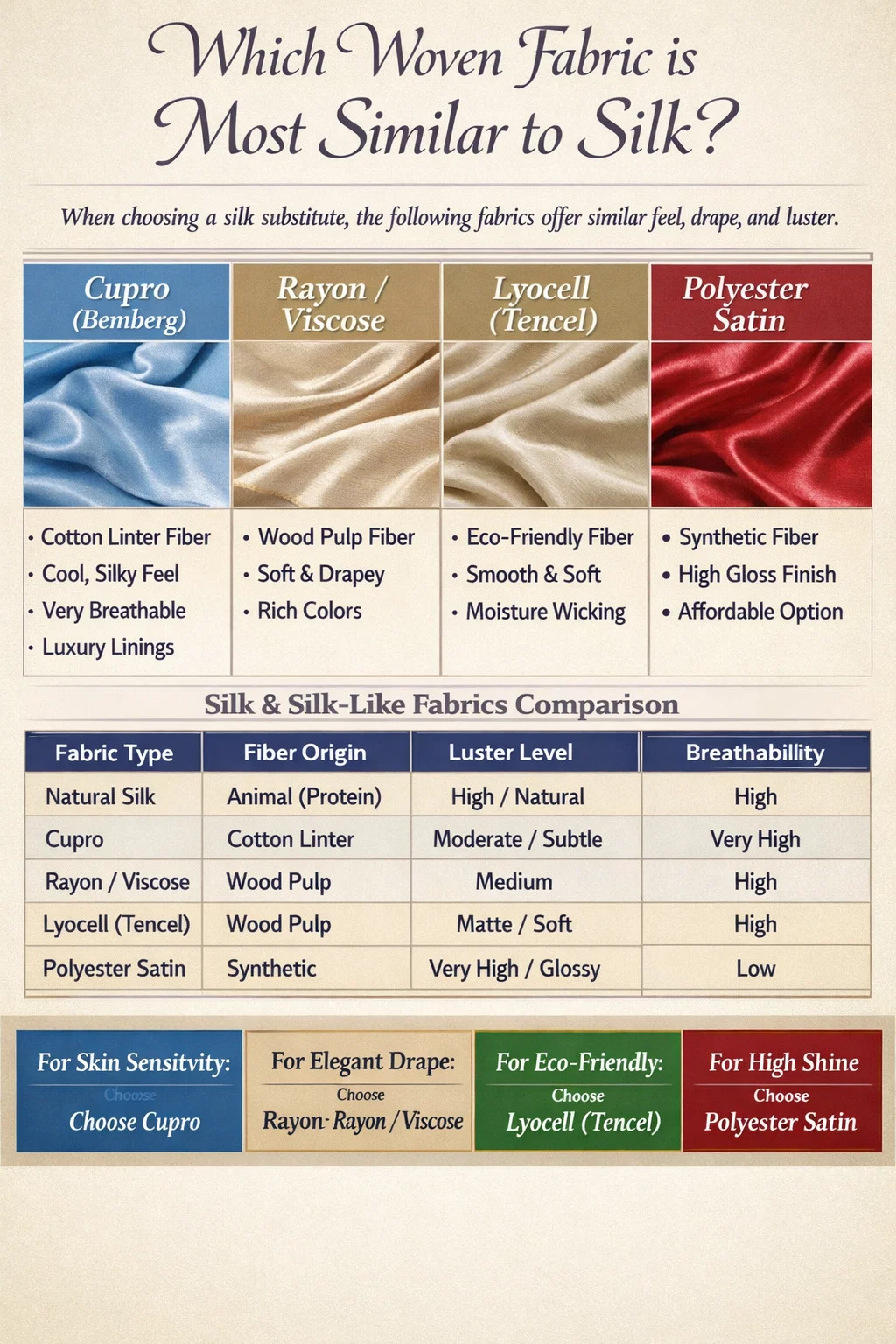 Bij het zoeken naar een geweven stof die het luxueuze gevoel, de glans en de drapering van natuurlijke zijde nabootst, zijn de meest prominente kanshebbers Rayon, Cupro en Lyocell (Tencel) . Onder deze, Cupro wordt algemeen beschouwd als de beste match in termen van ademend vermogen en zijdezachte aanraking, terwijl Satijngeweven polyester dient als het meest voorkomende betaalbare synthetische alternatief. Deze stoffen maken gebruik van specifieke weven technieken om de gladde eiwitvezels na te bootsen die door zijderupsen worden geproduceerd.